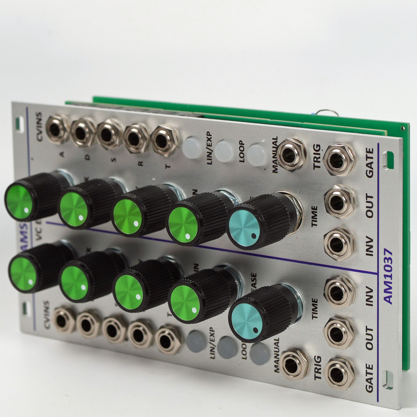 The attach, decay, sustain and release times of the AM1037 can be controlled by the control knobs and/or external CV signals that are patched into the module. The A, D and R stage timings can be varied from 1ms to 10 seconds, the timing can be adjusted by a factor of 100 either manually or by voltage control.